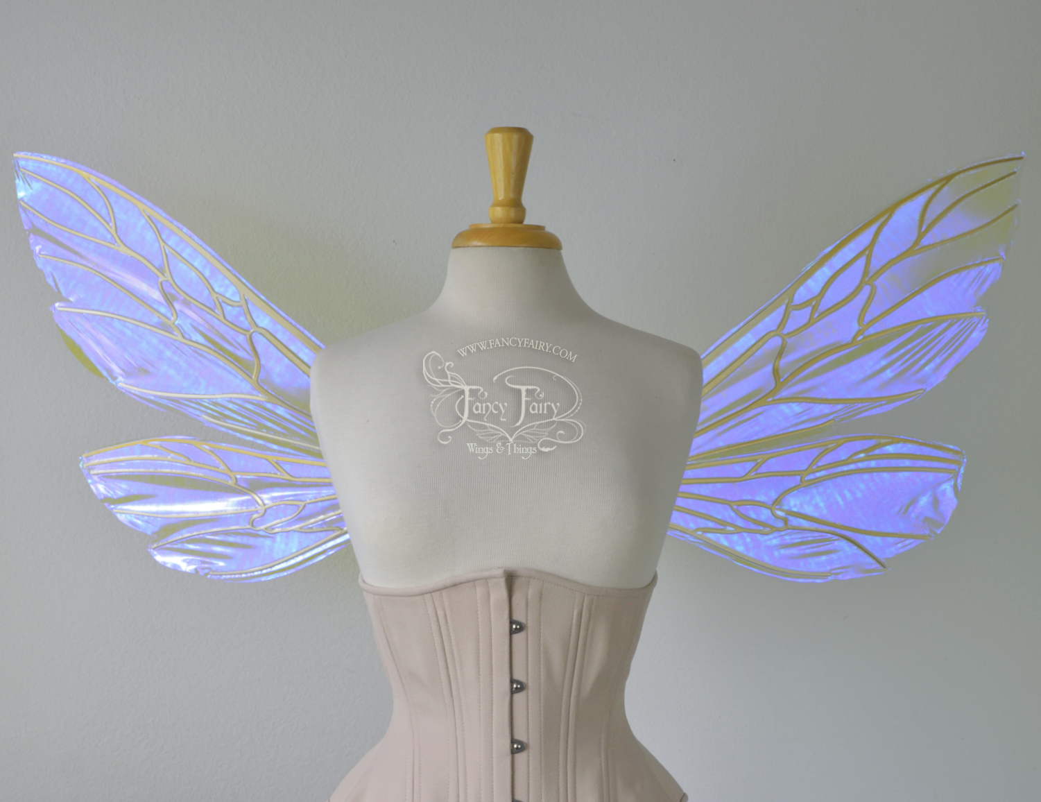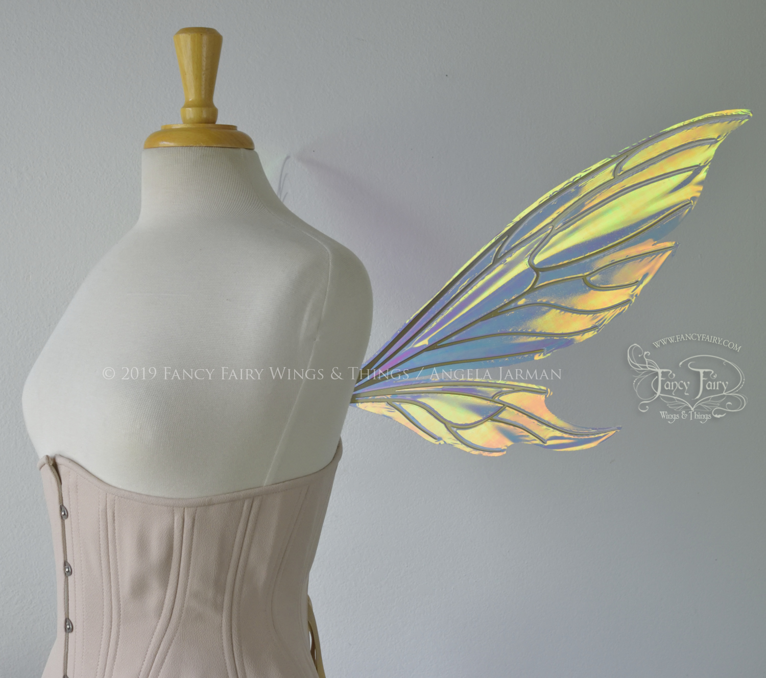 First, the Aquatica wings in Opal, which is a hybrid of the Satin White and Ultraviolet iridescent films that I fused together. It is a slightly more opaque whitish film with soft pink / peach, greens and violet/blue shine. The front is a bit more subtle and the back is more glossy.