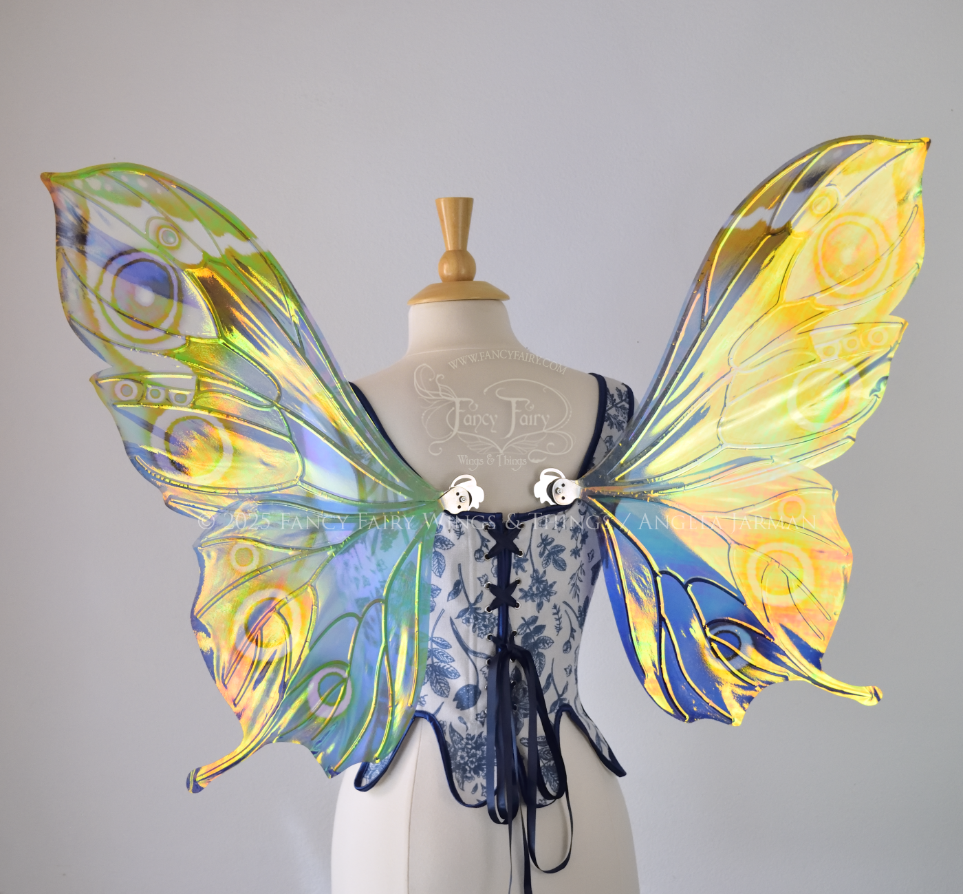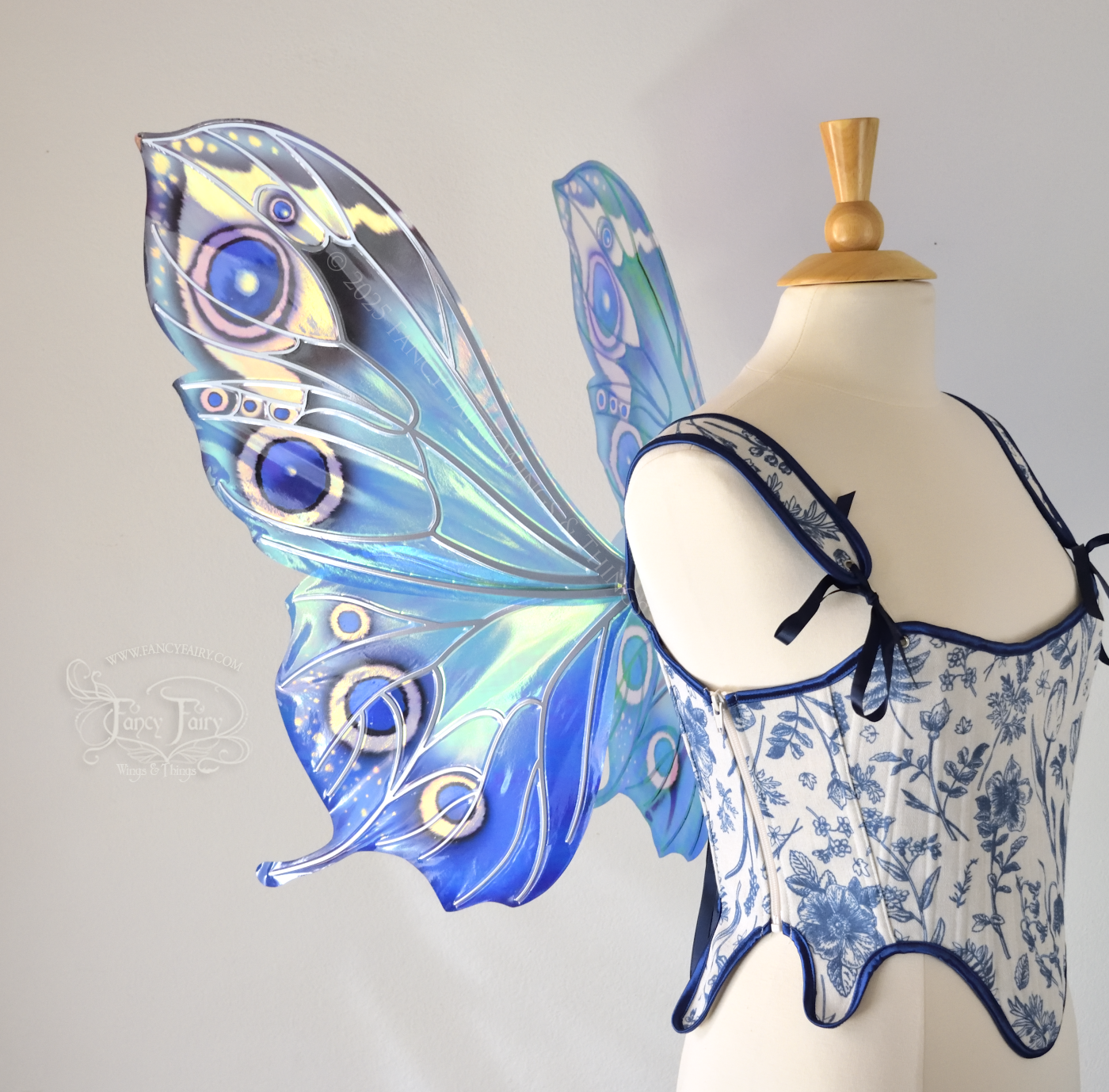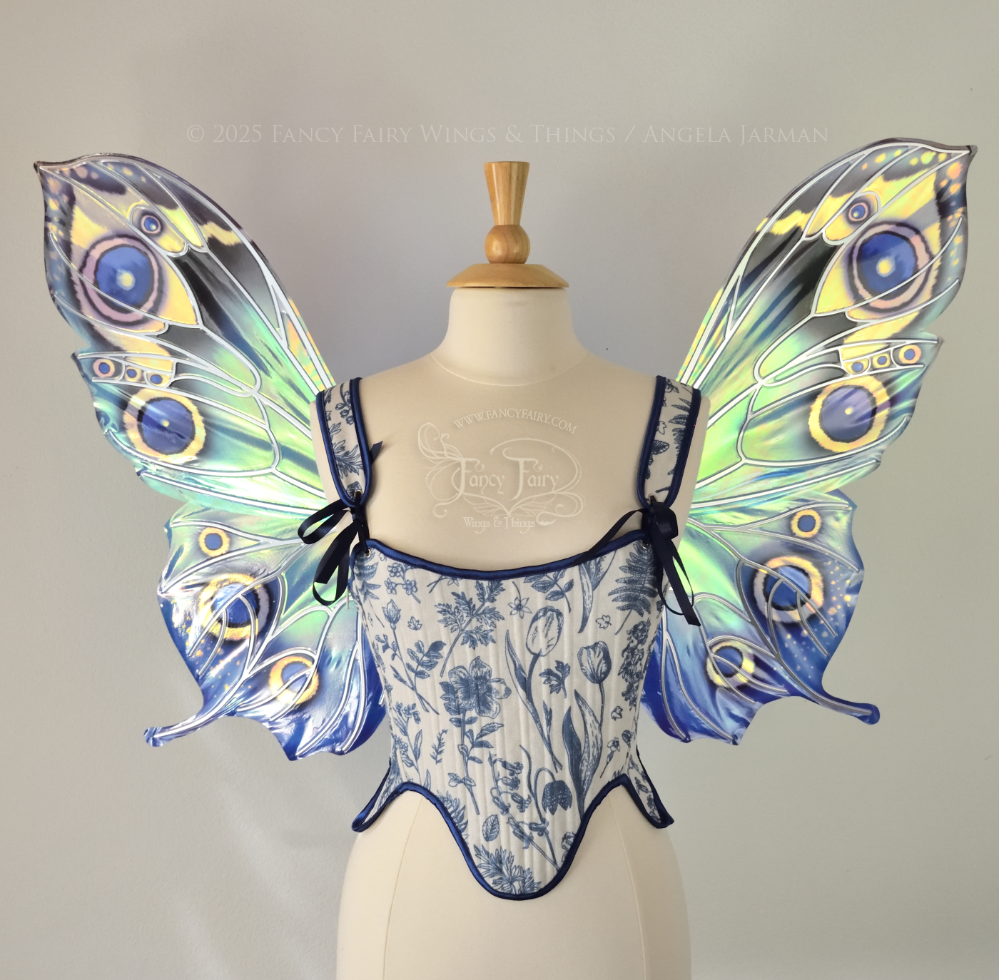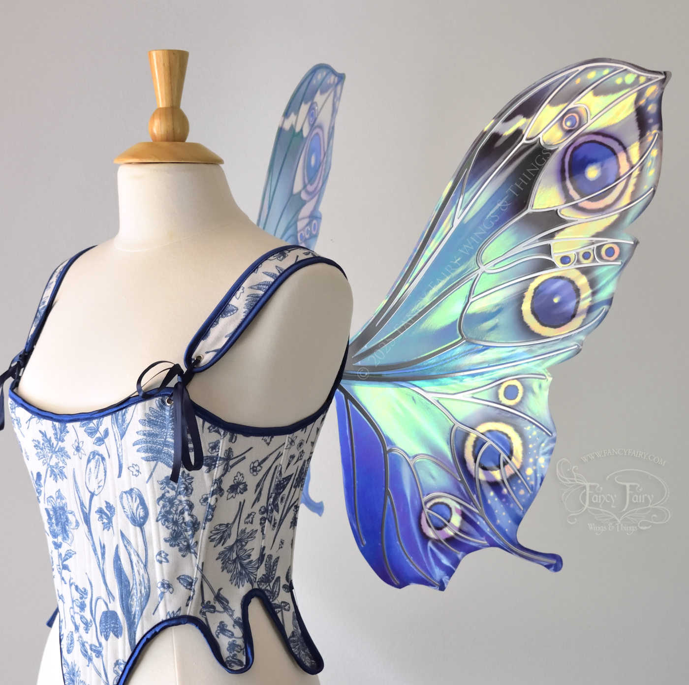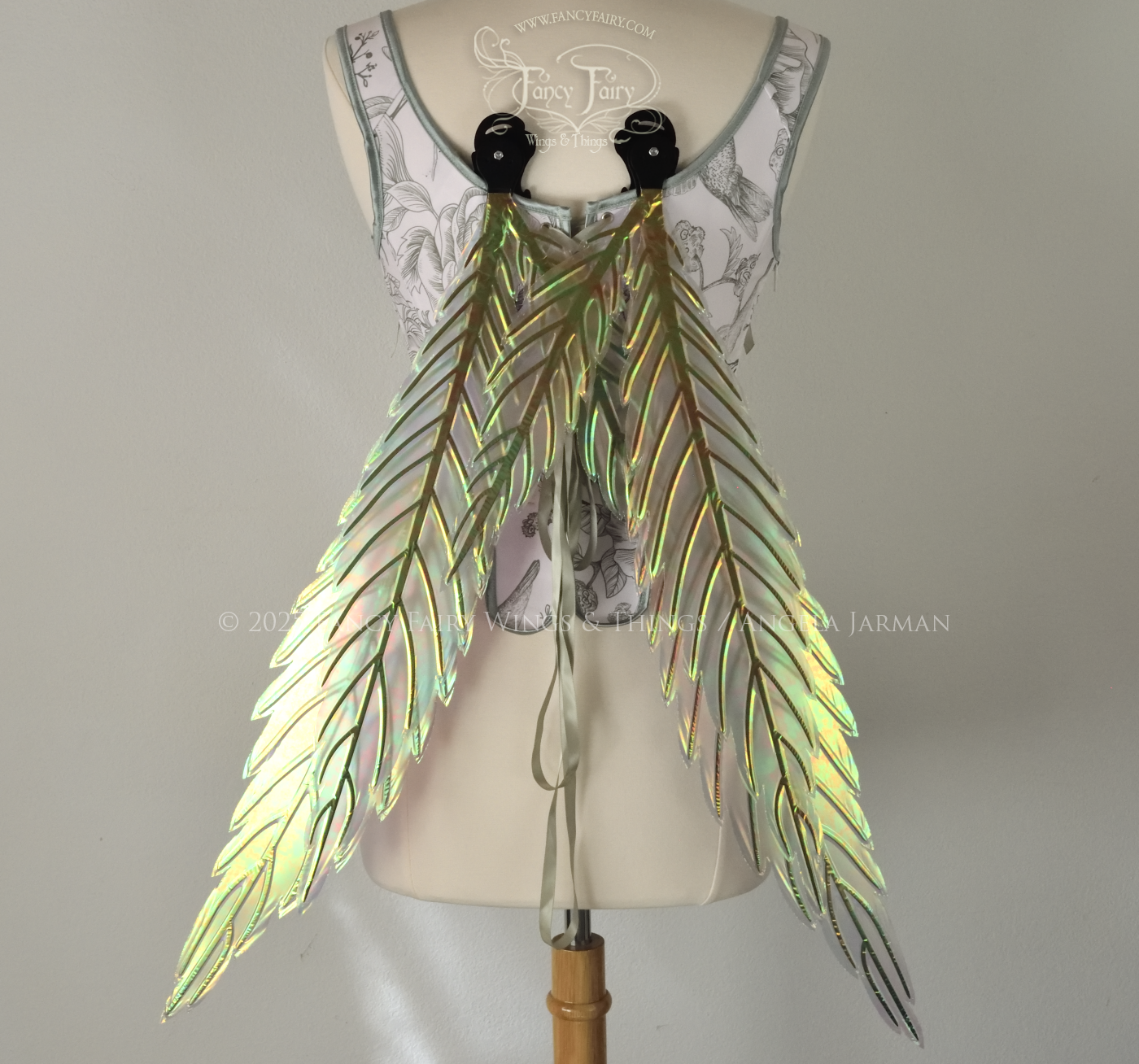 These Pansy wings (above) painted in a Blue Buckeye inspired colorway with silver veins, laminated onto the clear Diamond Fire film will be listing for $490 plus shipping, as will these Mary Jane fairy wings (below) laminated in Patina Green with black veins for $599 plus shipping.